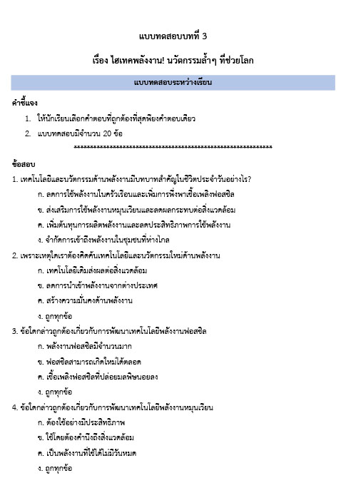 กระดาษคำตอบ แบบทดสอบ บทเรียนที่ 3